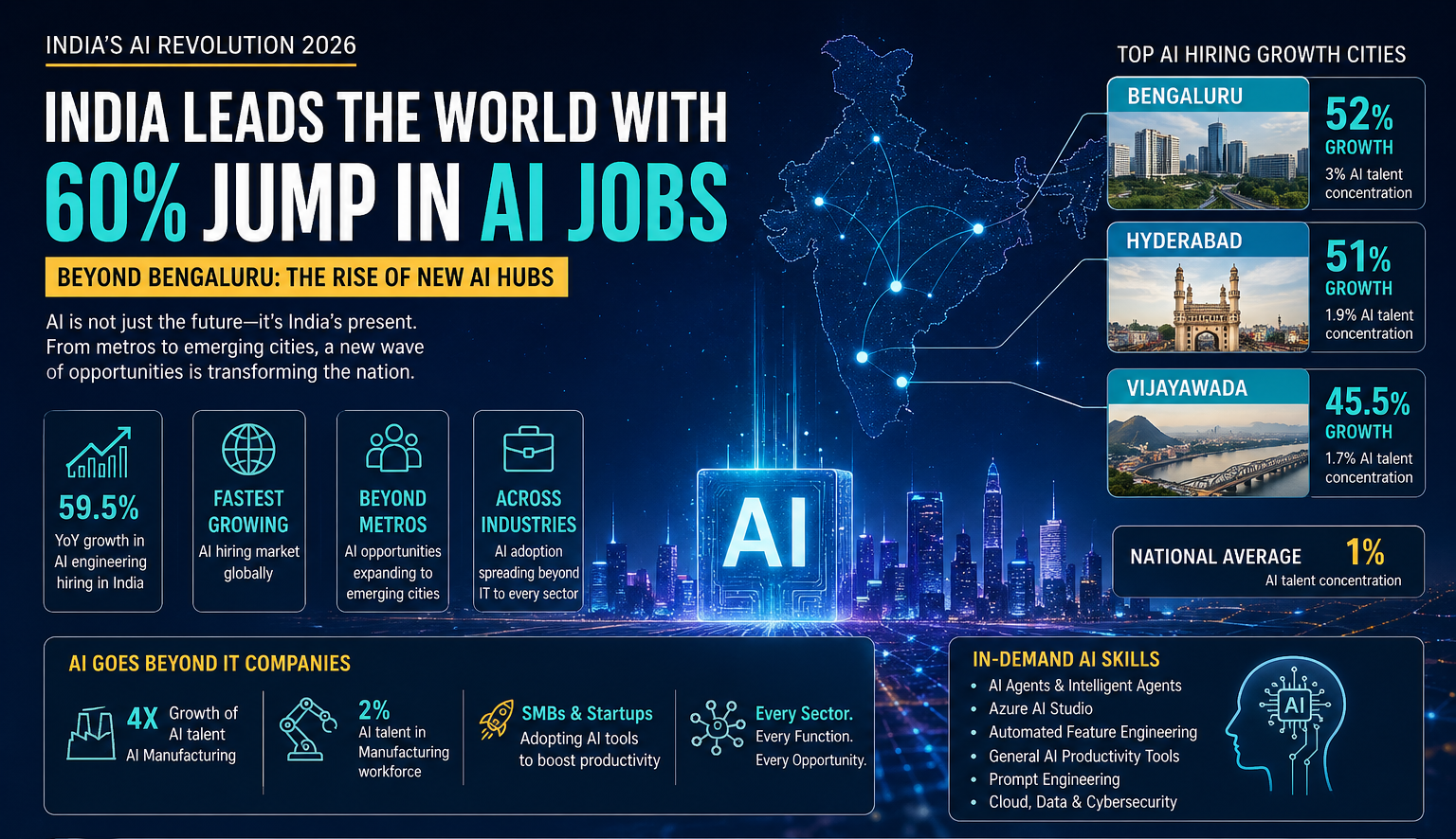 India is witnessing one of the biggest technological employment transformations in its modern history. While global discussions around Artificial Intelligence (AI) have often focused on automation, job displacement, and uncertainty, a different story is unfolding across India. The country is now experiencing record-breaking growth in AI-related employment, with emerging cities like Vijayawada rapidly entering the national technology landscape.